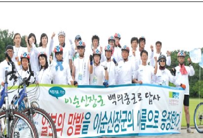 지난 15일 서울 광화문에서 출발한 순천향대학교 ‘이순신 백의종군로 자전거답사팀’이 16일 오후2시 충남 아산시 현충사에 도착해 독도 문제와 관련해 ‘일본의 망발, 이순신장군의 이름으로 응징한다’라는 현수막을 걸고 현충사 충무문 앞을 자전거로 도는 퍼포먼스를 펼쳤다.