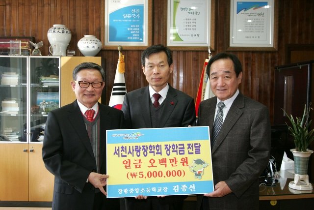 (사진 : 장항중앙초 김종선 교장이 개인 돈 500만원을 퇴임식 비용 대신 서천사랑장학회에 기탁했다. 왼쪽부터 김종선 장항중앙초 교장, 나소열 서천군수, 김중원 서천사랑장학회 이사장)